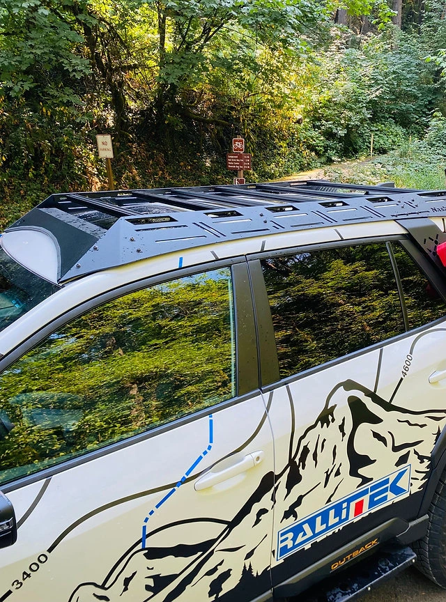 Enhance your Subaru Outback's cargo capacity and rugged style with the NashFabCo Outback Roof Rack. This American-made rack features a distinctive design with 45-degree side rails, creating a sleek, low-profile look that complements your vehicle. Built to withstand the demands of off-road travel, this robust roof rack provides a sturdy platform for carrying gear and accessories, making it the perfect companion for your next overland or off-road Subaru adventure.